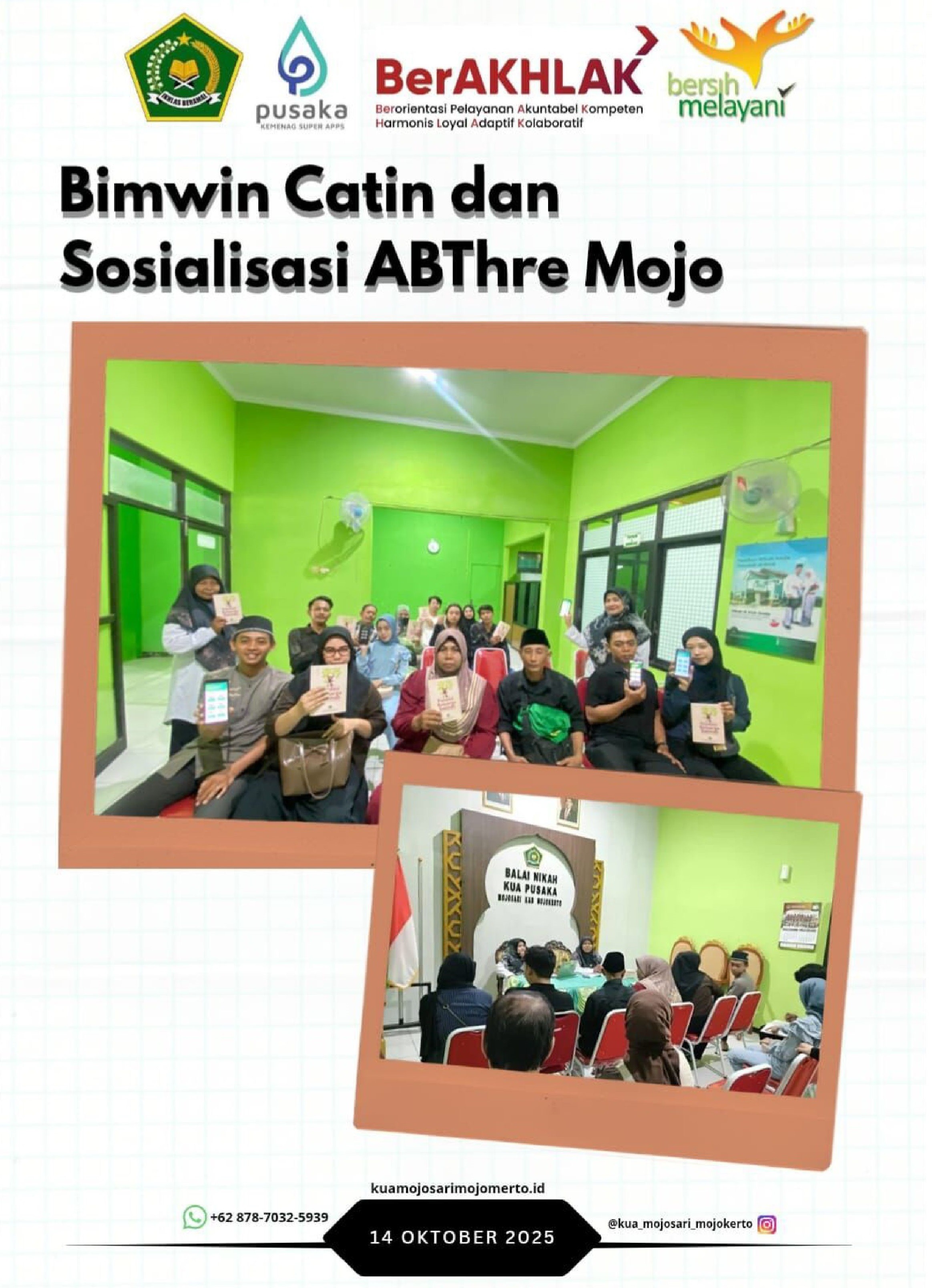 Mojosari, 14 Oktober 2025 — Kantor Urusan Agama (KUA) Kecamatan Mojosari kembali melaksanakan kegiatan Bimbingan Perkawinan (Bimwin) bagi calon pengantin. Kegiatan ini tidak hanya berfokus pada pembekalan menuju keluarga sakinah, tetapi juga dirangkaikan dengan sosialisasi inovasi digital “ABThree Mojo”, sebuah aplikasi penyuluhan berbasis Android yang digagas oleh Penyuluh Agama Islam Husnul Khotimah. Sementara itu, Usfuriyah bertindak sebagai pemateri kedua dalam kegiatan tersebut.