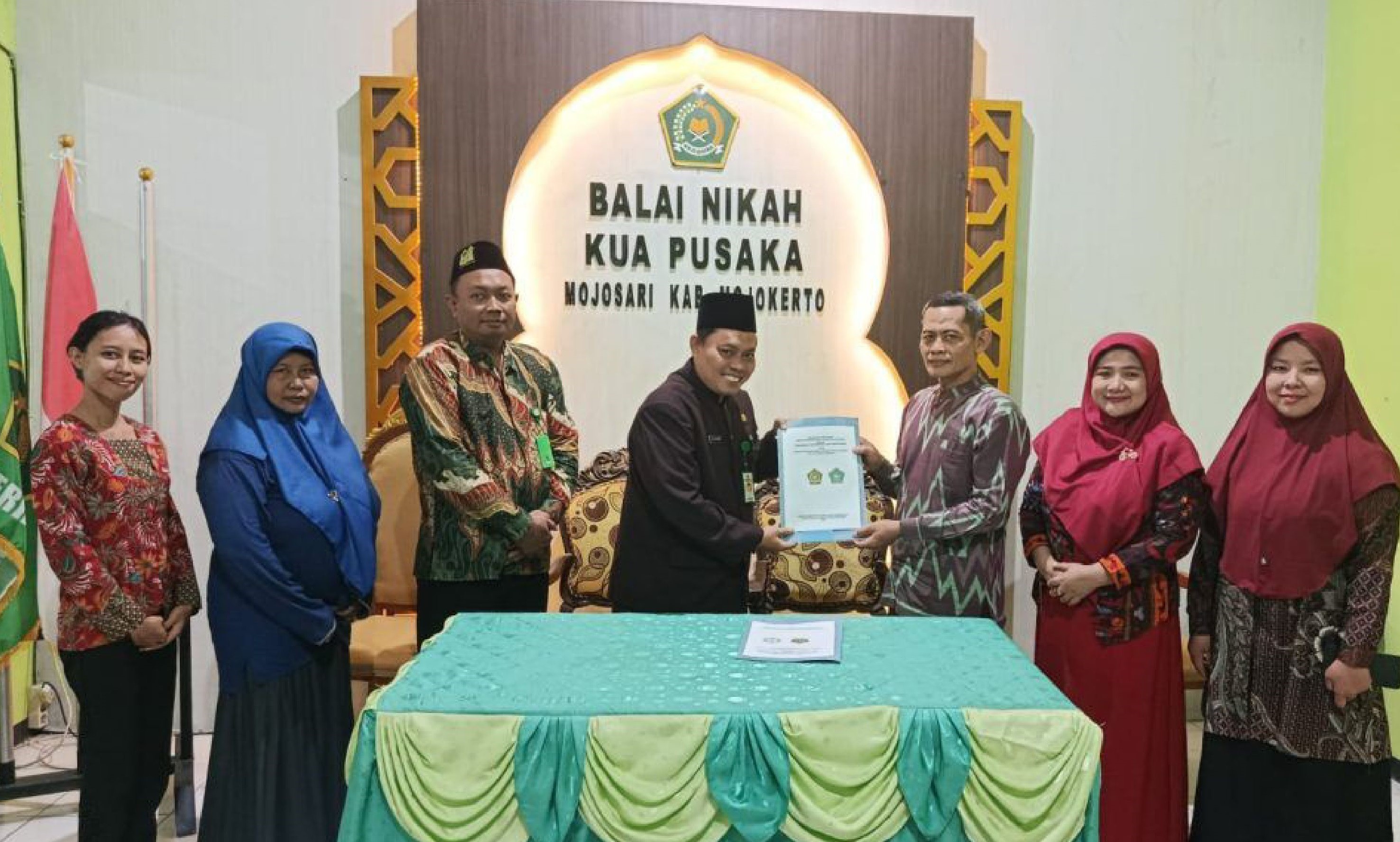 Kantor Urusan Agama (KUA) Mojosari menjalin kerja sama dengan SMP IT dan MA Mambaul Ulum Awang-Awang Mojosari melalui penandatanganan Nota Kesepahaman (MoU) yang dilaksanakan di ruang Balai Nikah KUA Mojosari, Jumat (10/10).